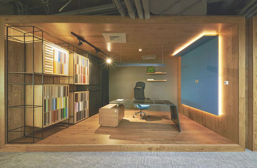 总经理办公室的设计:设计师在设计的时候,与总经理进行了深入的交流,在交流的过程中设计师了解到,总经理希望可以与员工一起奋战在第一线,故此设计师将其安置在开放又独立的空间之中,这样一方面可以为总经理提供一个独立的空间,同时又可以与员工在一起,激发员工的斗志。