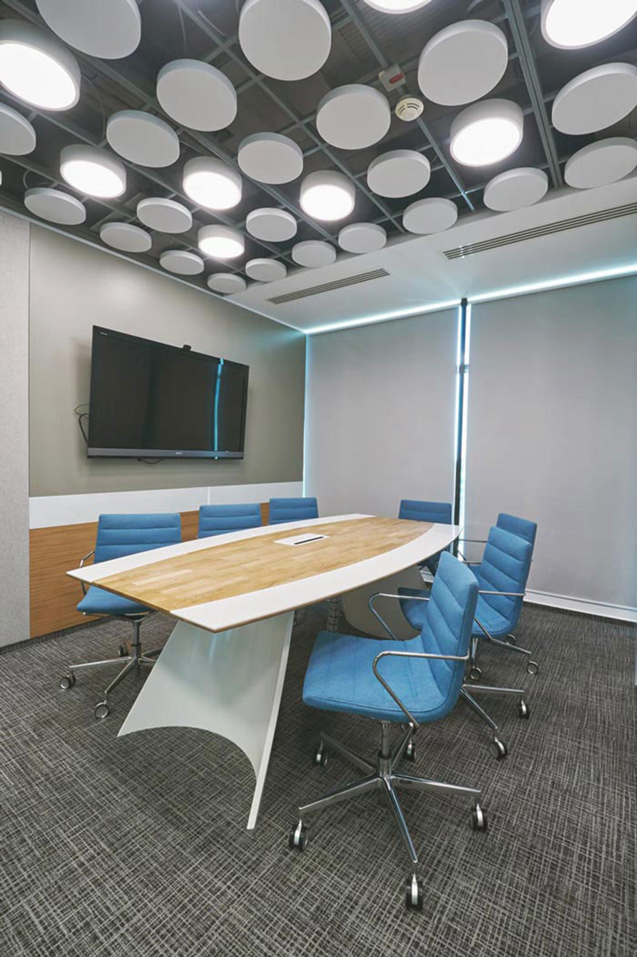 小型会议室的设计:设计师在设计的时候,摒弃了对空间有阻碍的任何设计,在设计师看来这样的空间应该以创意与畅通为前提,只有这样才能保证会议开展的时候大家可以畅所欲言,同时设计师在顶部的设计中将灯设置为圆形并排列在顶部空间,以此照亮员工的创意之路。