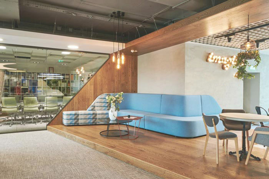 办公区域的设计:设计师在设计的时候,将其安置在靠近窗户的区域,在设计师看来员工更喜欢的是自然与阳光,故此设计师将采光以自然的设计手法引入室内,让员工时时刻刻沐浴在温暖的眼光中,让员工可以时时刻刻与自然为伴,这样对于员工个人的成长有积极的推动作用。