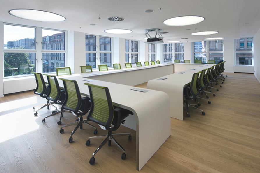 会议室的设计:此处可以容纳将近30个人,在这里开放是空间的主旋律,在这里员工感受到的是一种轻快之感,这也是设计师希望看到的,在设计师看来一个轻快的会议空间,可以在无形中化解对于员工的压力,让员工可以在这里的空间中得以自由发挥。