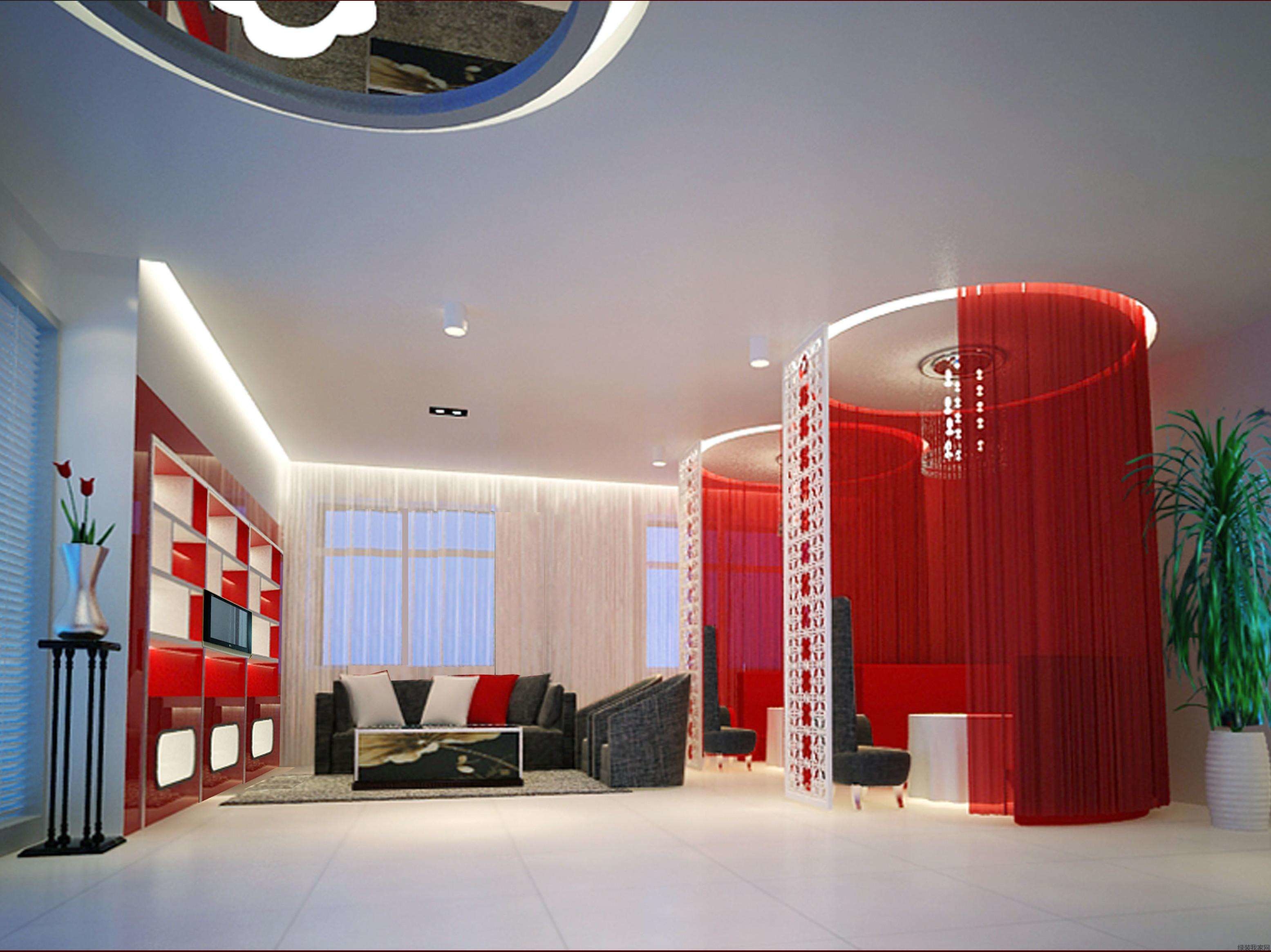 2、美容院设计装修施工的现代简约风格以硬朗色系中心色红色为主,那么,整个美容院空间的地面铺红色地毯。窗帘使用蓝白的印花布,与红色地毯成强烈对比。而沙发选择使用黑色,家具以白色为主,墙和天花板也以白色为主,这样就可以避免色彩对比强烈而显得刺眼。
