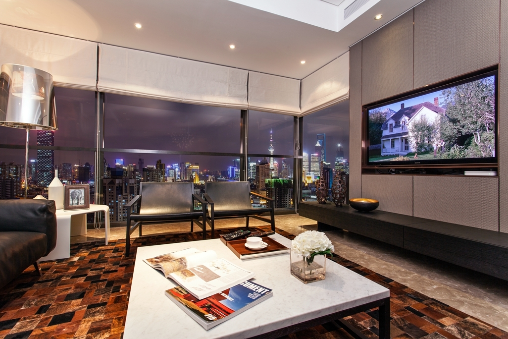 以往别人家的电视墙与其他墙面都是一样的,而现在往往选择电视墙与客厅其他墙面不一样。对电视墙进行单独的设计与装修,如采用纹理粗糙的文化石 镶嵌。从功能上说,文化石可以吸音,避免音响对其他居室的影响,从装饰效果上看,它烘托出电器产品金属的精致感,形成一种强烈的质感对比,十分富有现代感。旁边设置两个橱架摆放着主人心爱的艺术品,点缀其间,体现主人的高雅气质。