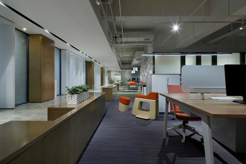 因为人多的办公空间,一般为了节省空间,布局方式以整列为主,不容易做出花儿来,但是作为奠定基调的主空间,除了简洁大气,明亮开敞、还是能在材质,色调、装饰方面做出格调来的。